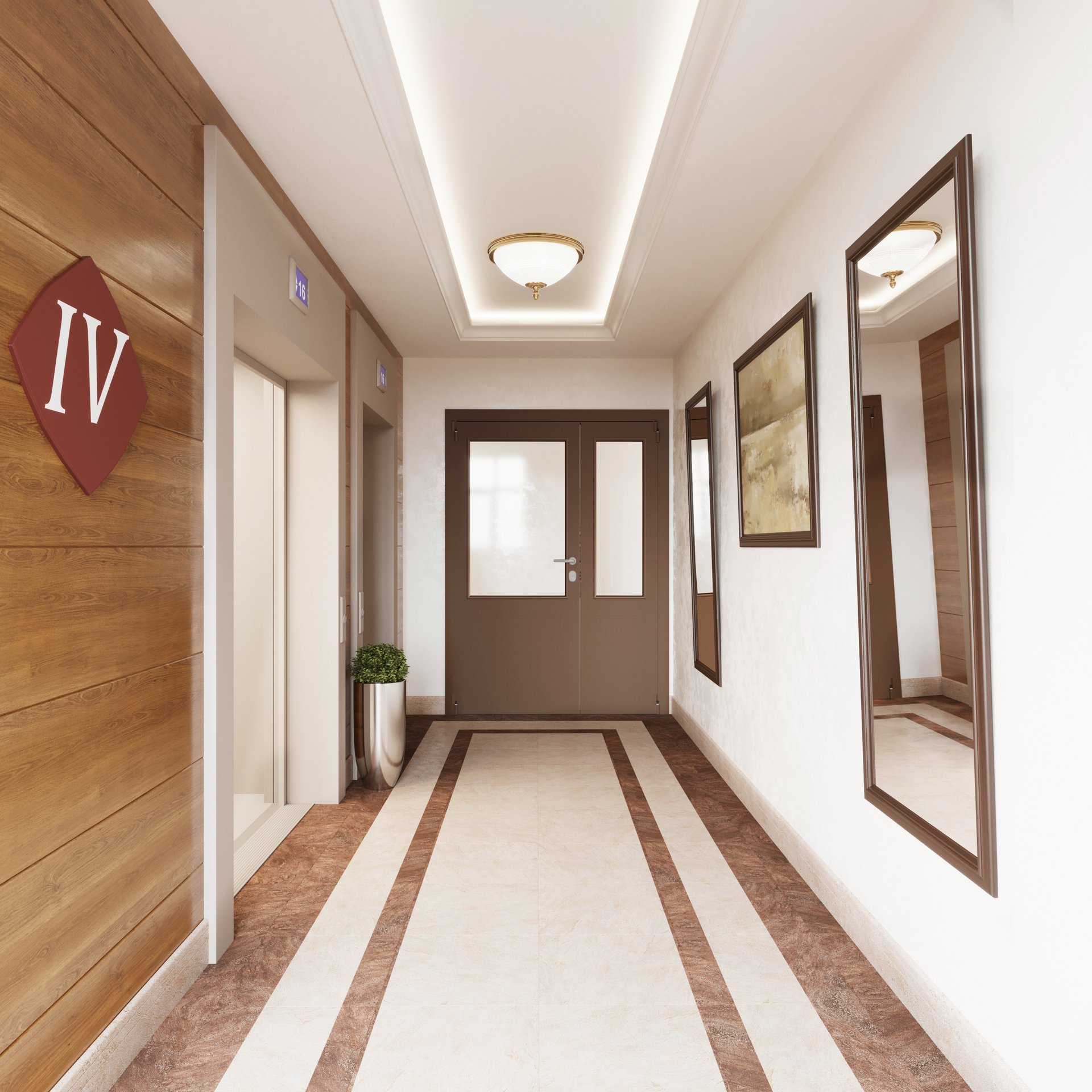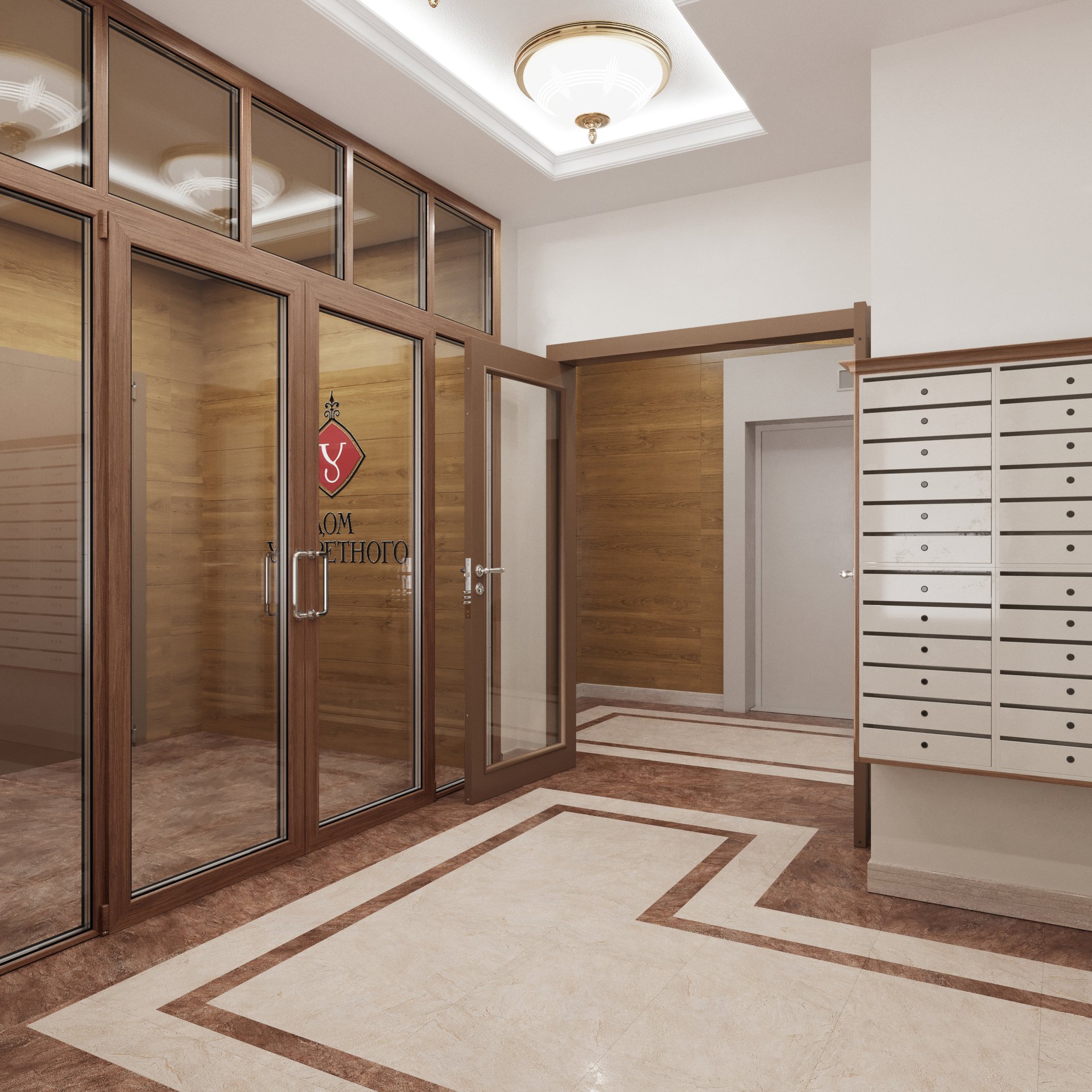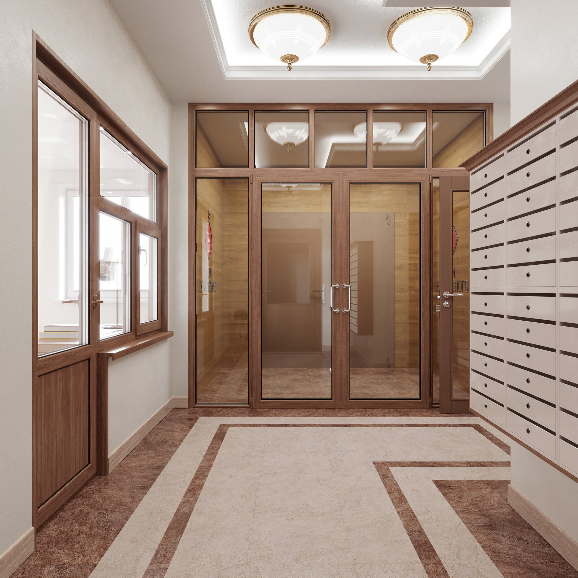 Парадный холл, почтовые ящики и лифтовая зона